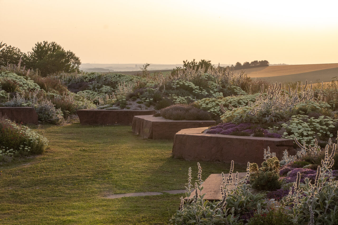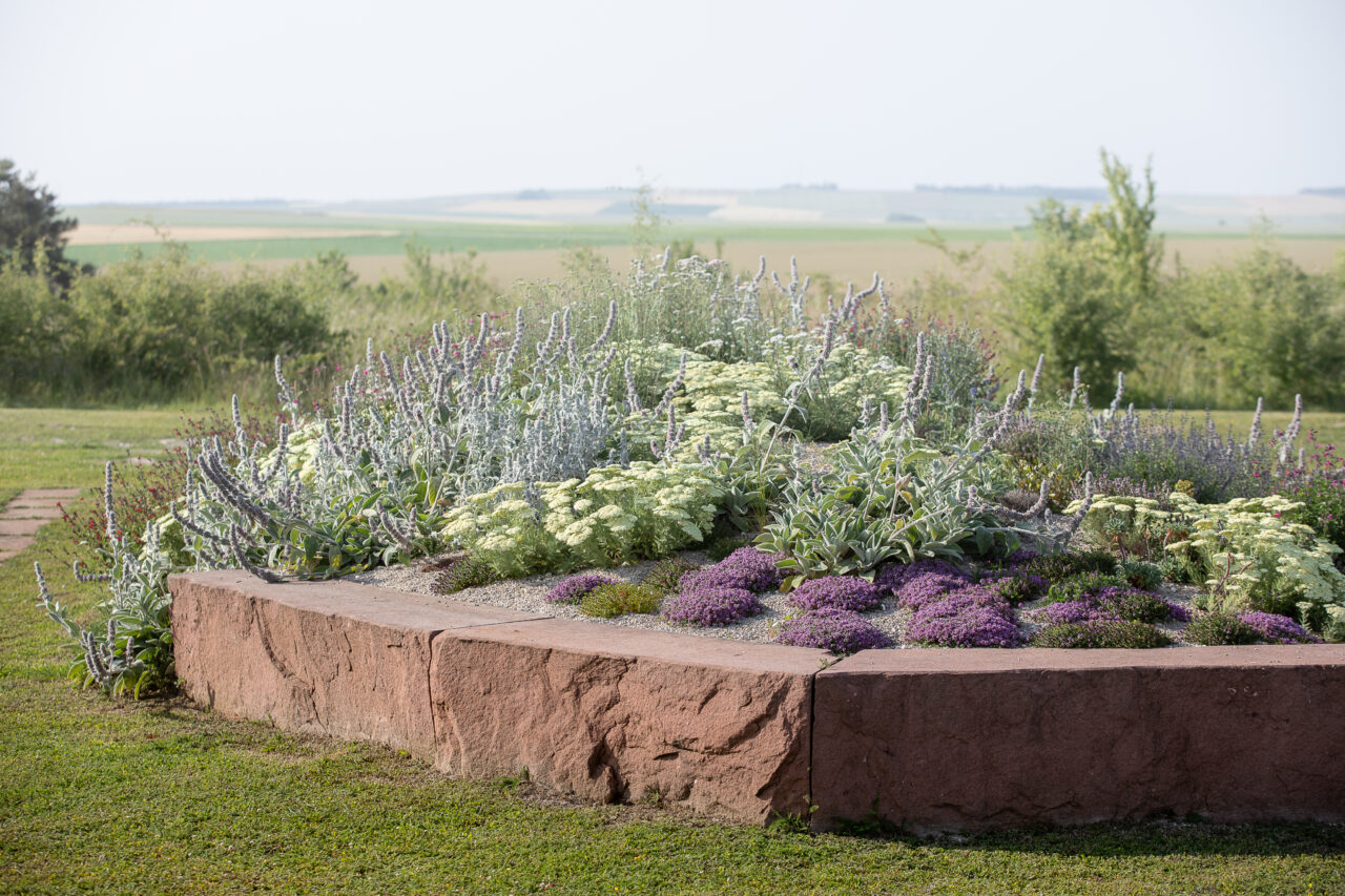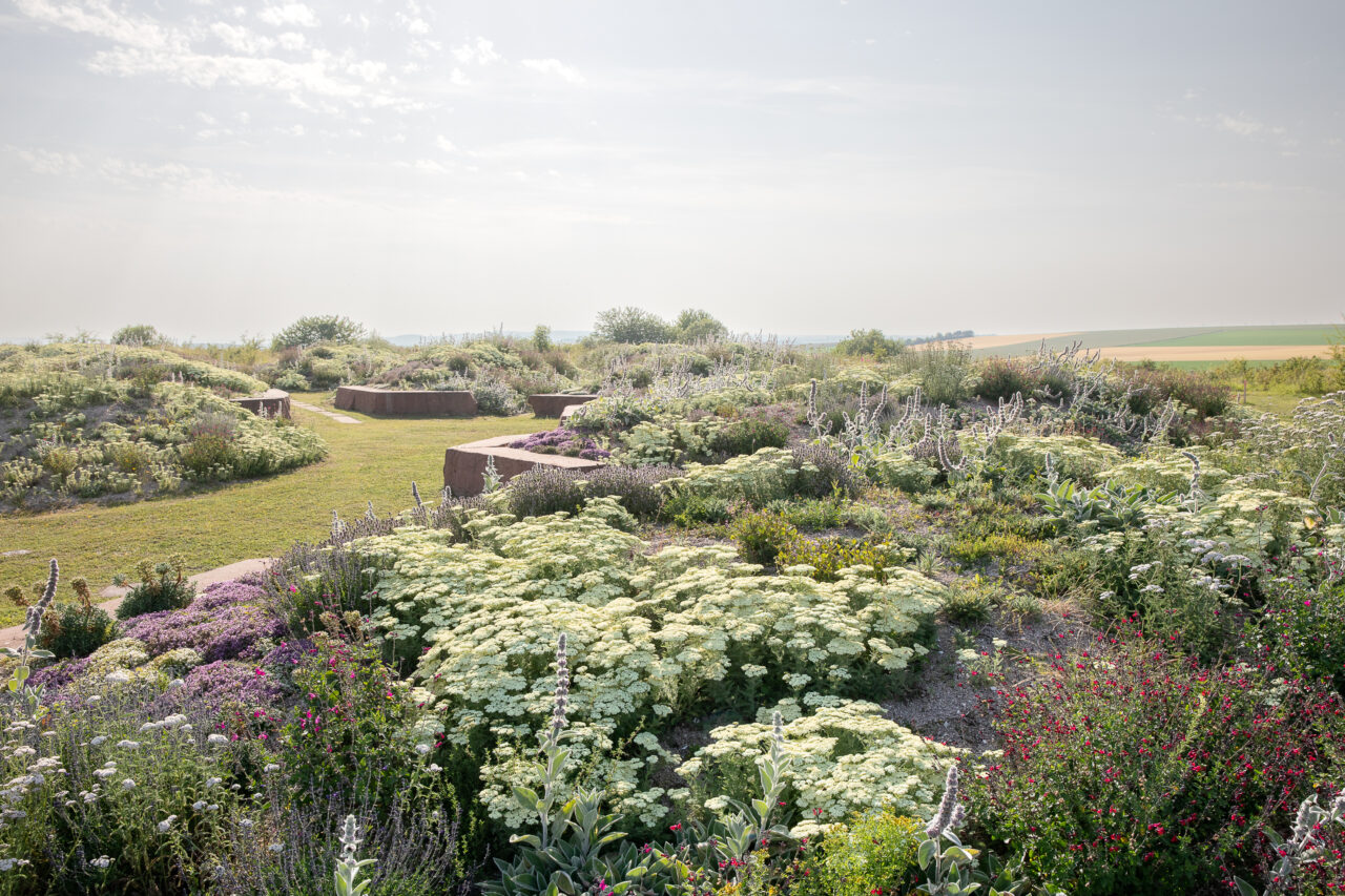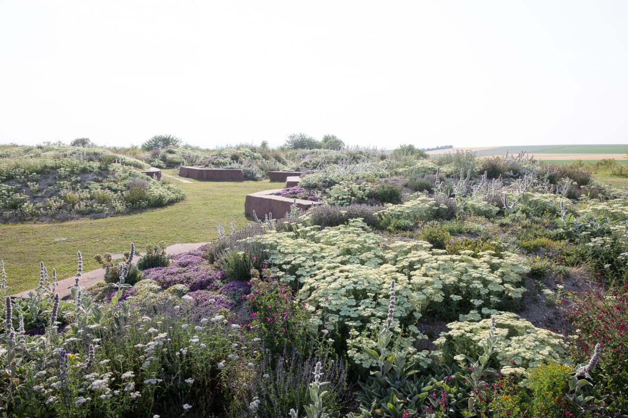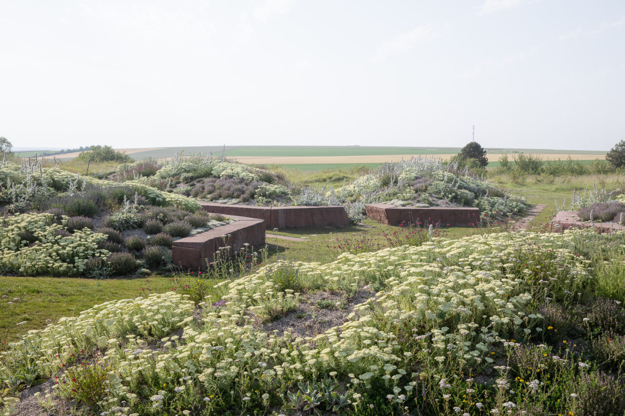 Inspired by the marks that war has left on the landscape, particularly the front line dug by soldiers, the garden consists of embankments separated in their center and stone slabs placed as hyphens between them. Visitors can thus move between these spaces and sit on the seating areas located on the edge of the embankments. Furthermore, while during the war, the trench was often the only horizon for soldiers, the garden symbolically opens up to the surrounding landscape in order to offer new perspectives.